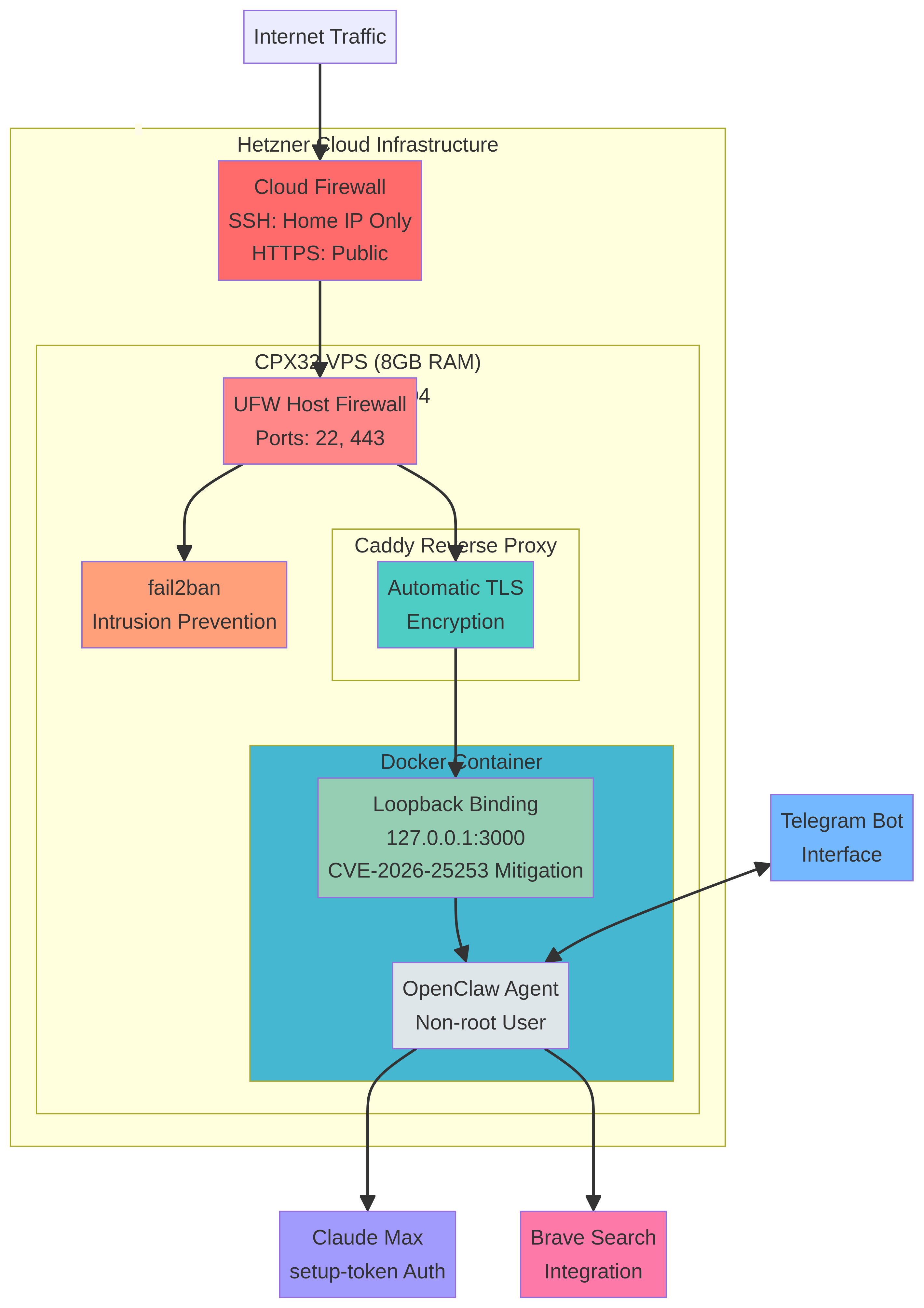 Complete security architecture for Benny on Hetzner CPX32: Cloud Firewall → UFW → Caddy TLS → Docker → OpenClaw loopback binding