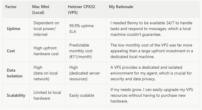 My first major decision was choosing the right infrastructure. While many guides suggest using a local machine like a Mac Mini, I quickly realised that this approach wouldn’t meet my requirements for a production-ready agent. I needed a solution that offered 24/7 uptime, data isolation, and a predictable cost structure. After careful consideration, I chose to deploy Benny on a Hetzner CPX32 Virtual Private Server (VPS) with 8GB RAM, running Ubuntu 24.04.
