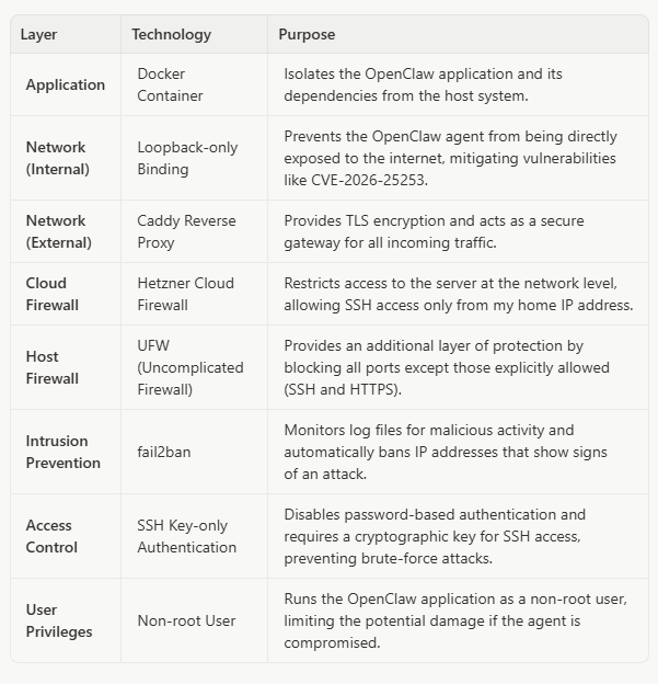 This multi-layered approach ensures that Benny is protected at every level, from the application itself to the underlying infrastructure. The loopback-only binding is particularly important. It ensures that the OpenClaw agent is only accessible from the local machine, and not directly from the internet. This is a critical mitigation for vulnerabilities like CVE-2026-25253, which could allow an attacker to gain control of your agent if it’s directly exposed.